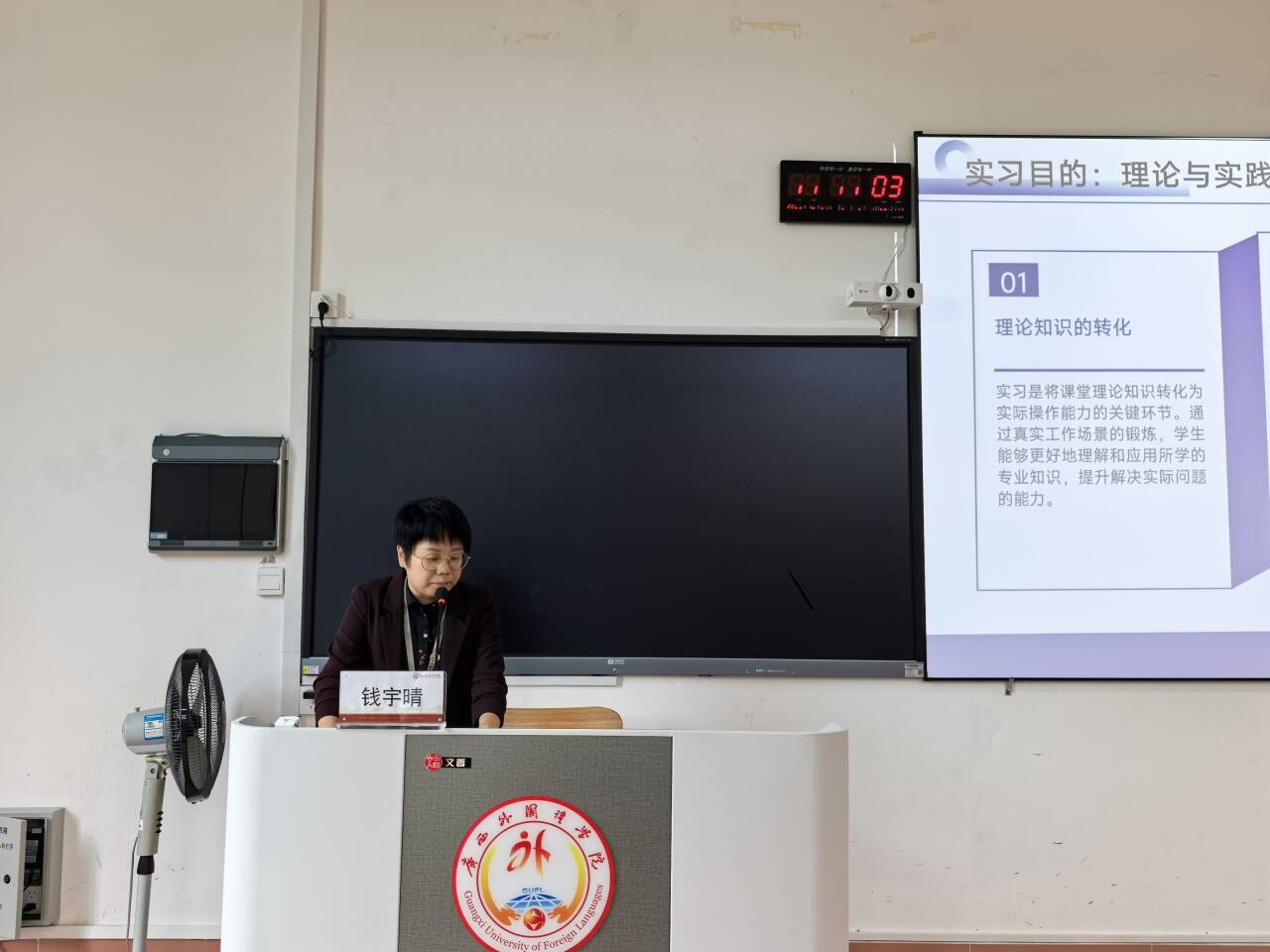 本次毕业实习动员大会由黄湘倚老师主持。首先,钱宇晴副院长作实习动员讲话,深入剖析毕业实习的重要意义。她强调,实习是同学们将理论知识转化为实践能力的关键环节,希望大家在实习中保持谦逊恭敬的态度,积极运用专业知识解决企业实际问题,在实践中提升解决问题和抗压能力,为未来职场发展筑牢根基。