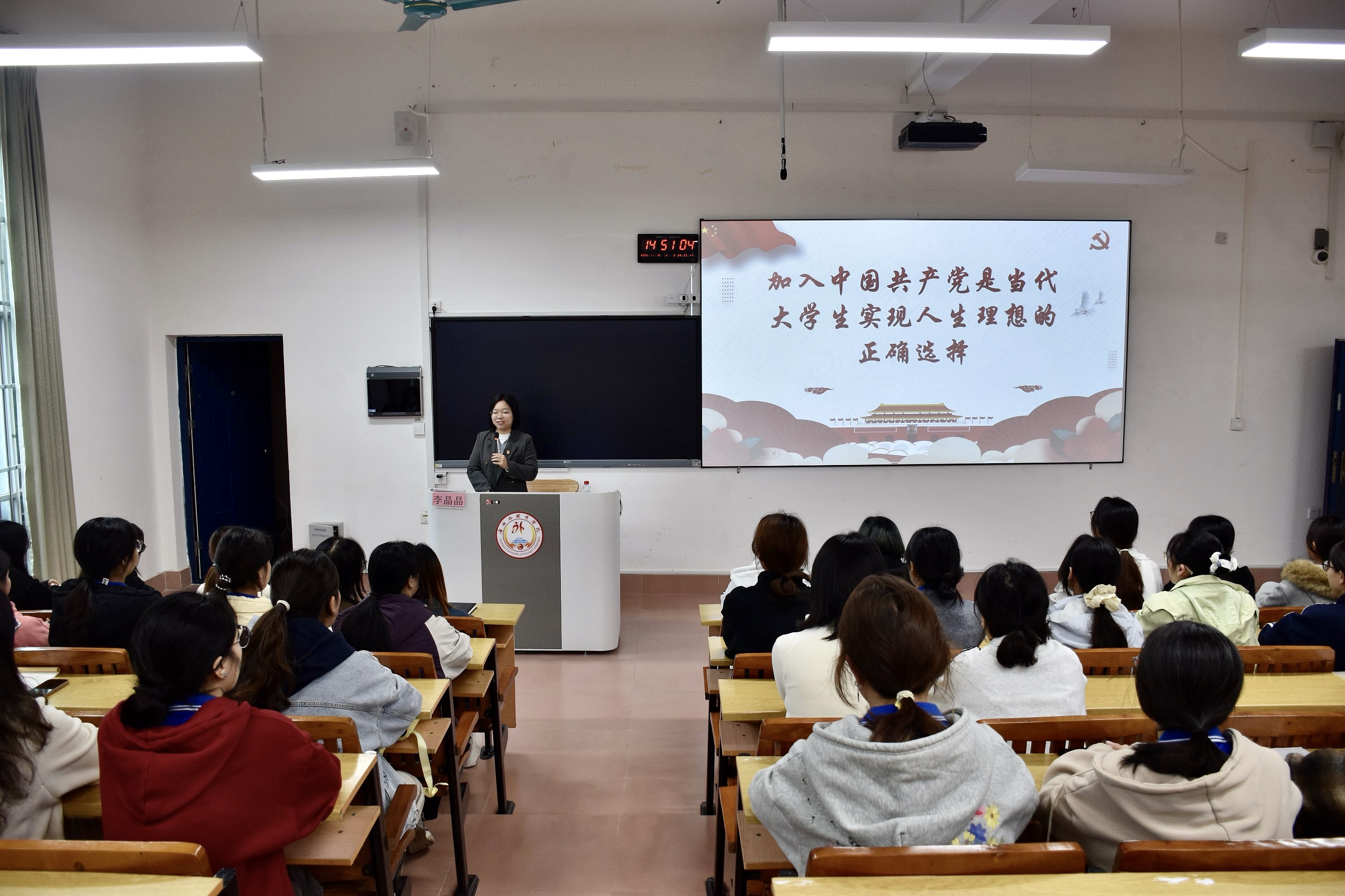 授课伊始,李晶晶老师以“中国共产党是当代大学生实现人生理想的正确选择”为核心,进行了深入浅出的系统讲解。她紧扣时代发展脉搏,结合大学生成长成才实际,全面阐述了中国共产党带领全国各族人民取得的辉煌成就,深刻论证了党的奋斗目标与青年学生个人价值实现的内在统一性,引导同学们深刻认识到,唯有将个人理想融入党和人民的伟大事业,把青春奋斗融入国家发展大局,人生才能绽放最绚丽的光彩。