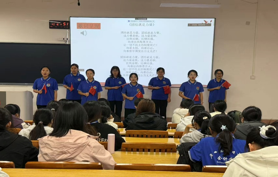 活动伊始,全体起立合唱《团结就是力量》《义勇军进行曲》。随后,各小组依次上台,结合自身理解分享红歌的创作背景与精神内涵,并满怀热情地演唱了《强军战歌》《我和我的祖国》《没有共产党就没有新中国》等经典曲目,用歌声传递对党的忠诚与对祖国的热爱。