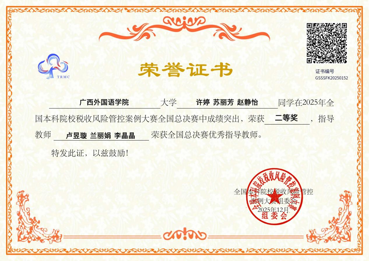 本次全国总决赛于浙江财经大学举办,是入选全国大学生专业竞赛目录的A类赛事,在财税类专业竞赛中具有广泛影响力,参赛院校众多、竞争激烈。广西外国语学院会计学院参赛团队(成员:许婷、苏丽芳、赵静怡)凭借对税收风险管控知识的精准理解与灵活应用,在案例分析、解决方案制定及现场答辩等环节展现出卓越的税收专业素养和创新实践精神,最终荣获全国二等奖。