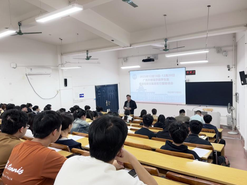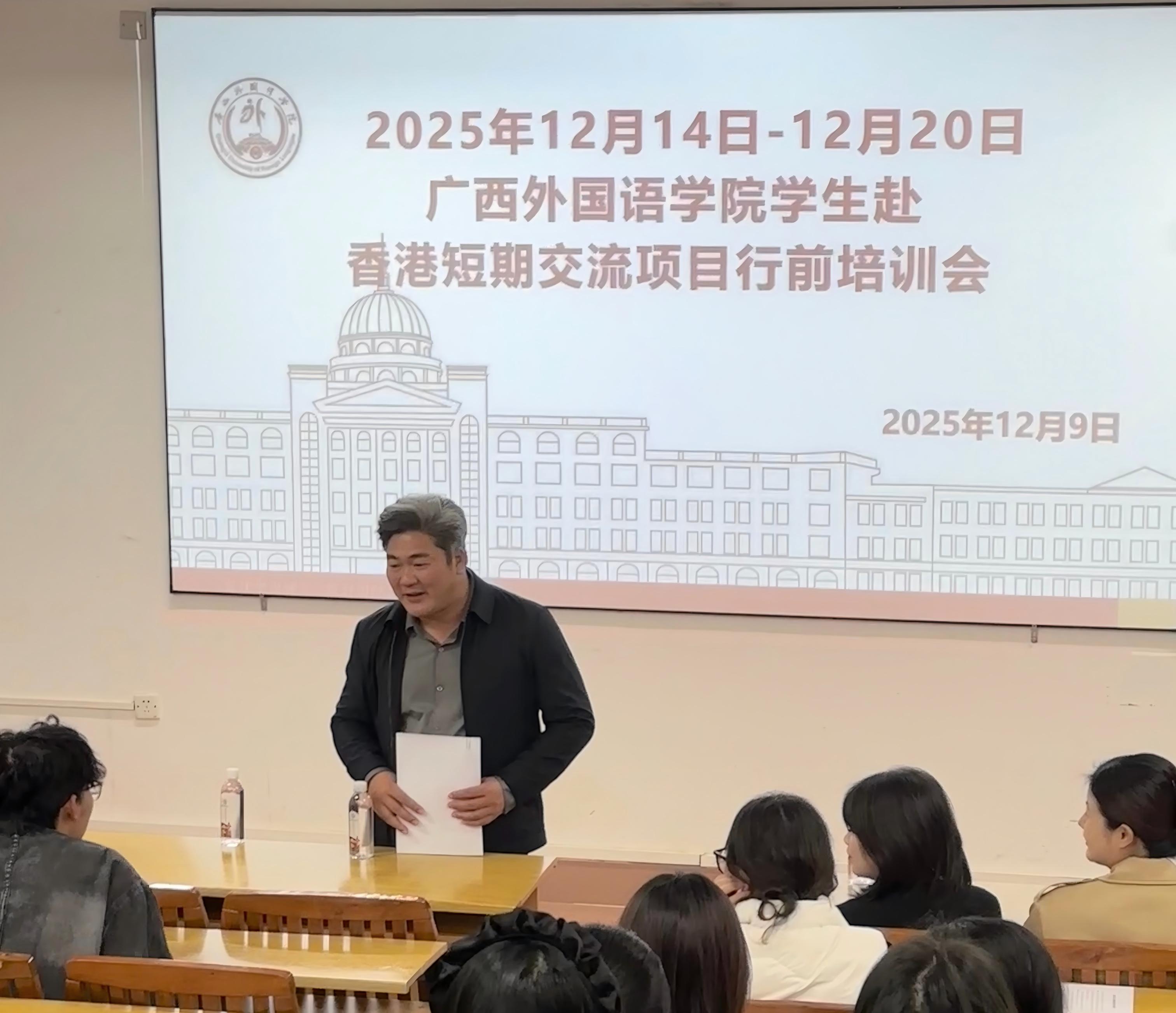 2025年12月9日下午,会计学院参与香港短期交流项目的学生在A103教室参加2025年12月广西外国语学院学生赴香港短期交流项目行前培训会。学校党委副书记钟志锋及相关领导、负责老师出席会议,本次赴香港短期交流项目全体学生参加会议。