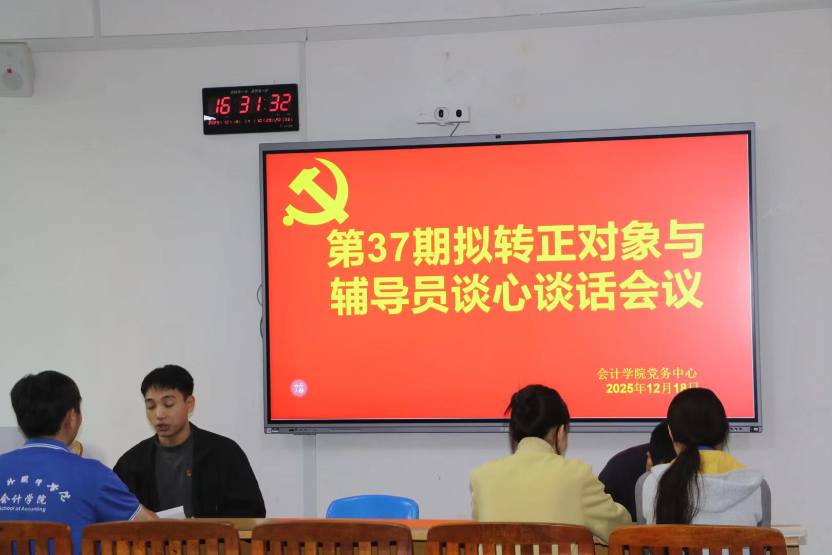 会计学院党总支于2025年12月18日下午16:20在大同楼D209召开辅导员与第37期拟转正对象谈心谈话会议。第37期拟转正对象及各位辅导员同志参与本次会议。