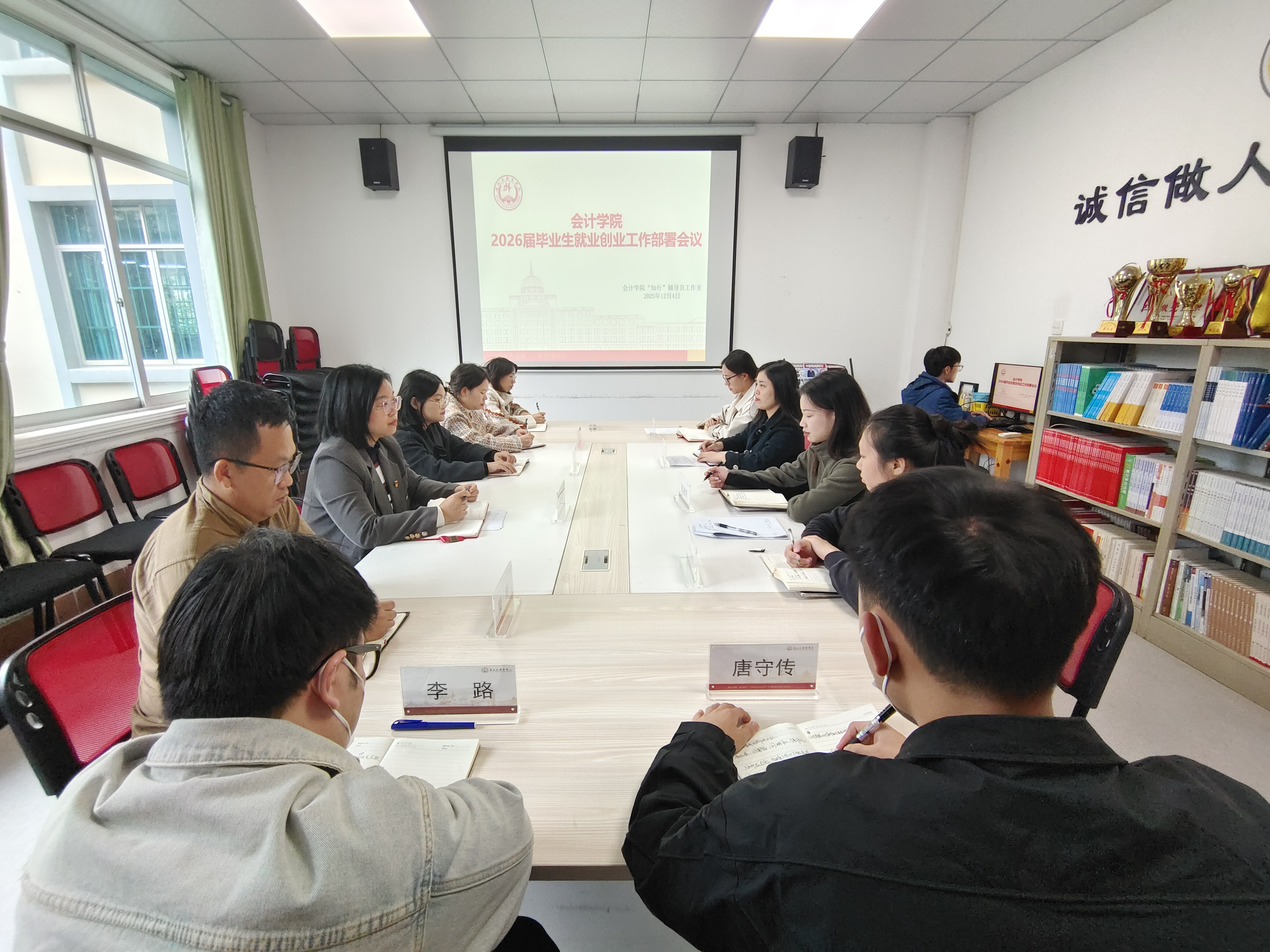 2025年12月4日,会计学院“知行”辅导员工作室召开2026届毕业生就业创业工作部署会,立足当前就业形势,紧扣专业育人特色,提早谋划布局新一届毕业生就业创业工作,为推动学生实现更高质量就业锚定方向、夯实根基。本次会议由学院就业工作负责人唐季利老师主持,工作室全体辅导员参会,学院党总支副书记李晶晶同志出席并作专项工作部署。