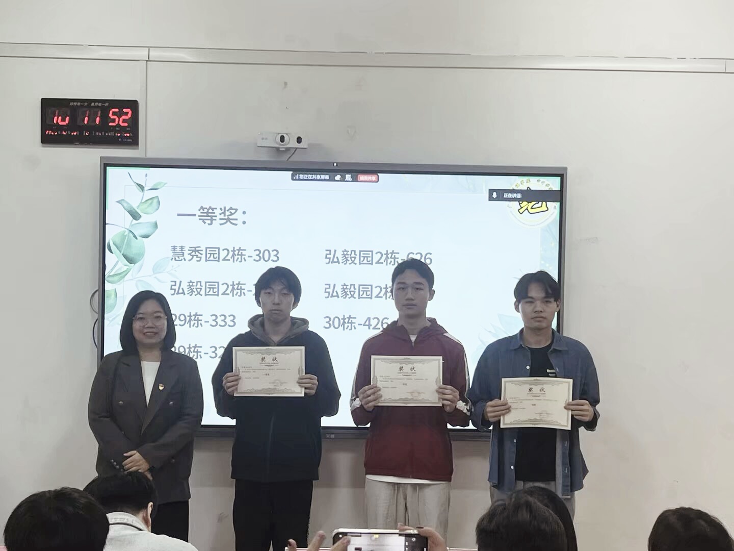 本次评比由学院纪检中心组织开展,围绕内务卫生、纪律遵守、文化氛围、团队协作等方面进行综合考评,最终评选出一批表现突出的优秀宿舍。活动颁奖环节,主持人宣读获奖宿舍名单。与会老师为各获奖宿舍学生代表颁发荣誉证书及奖品,现场气氛热烈,掌声不断。