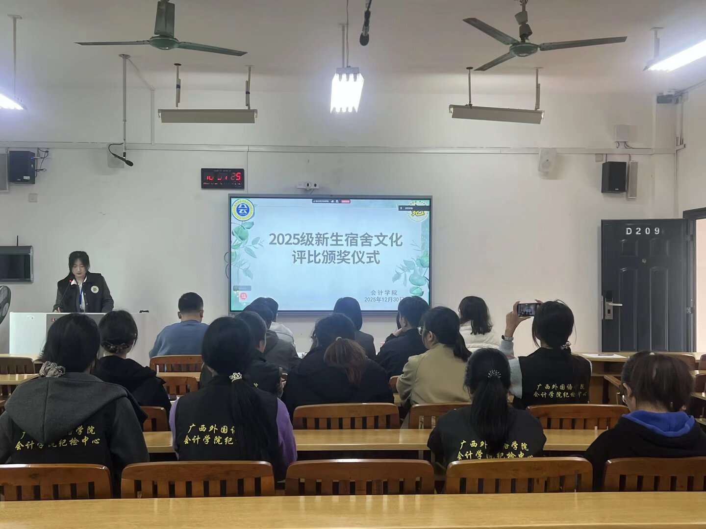 表彰在宿舍文明建设中表现优异的集体,树立自律向上的校园风尚,2025年12月30日下午,会计学院在空港校区大同楼101教室与五合校区大同楼D209教室,同步举行2025级新生宿舍文明建设评比颁奖仪式。学院党总支副书记李晶晶副教授,教师代表樊朴、李路、罗秀娟、李文燕,实习生吴佳龙、屈彦运,纪检中心学生干部及获奖宿舍学生代表共同参加。本次颁奖仪式由学院纪检中心袁家星主持。