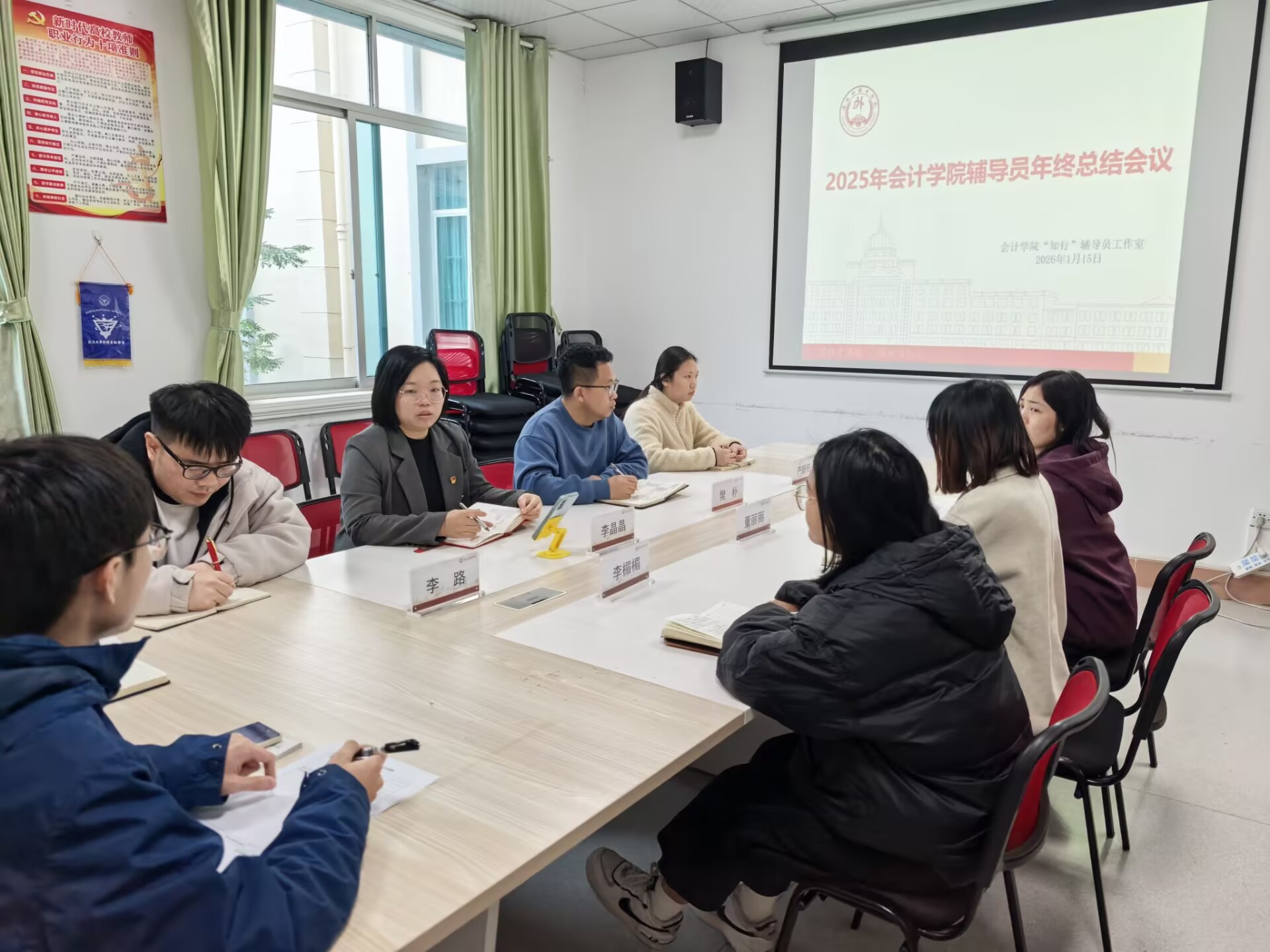 1月15日,会计学院“知行”辅导员工作室召开2025年度工作总结会议。学院党总支副书记李晶晶及全体专职辅导员参会。