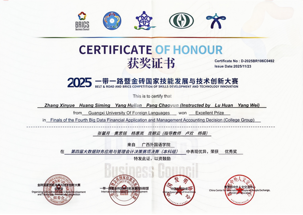 2025一带一路暨金砖国家技能发展与技术创新大赛大数据财务应用与管理会计决策赛项全国总决赛优秀奖证书