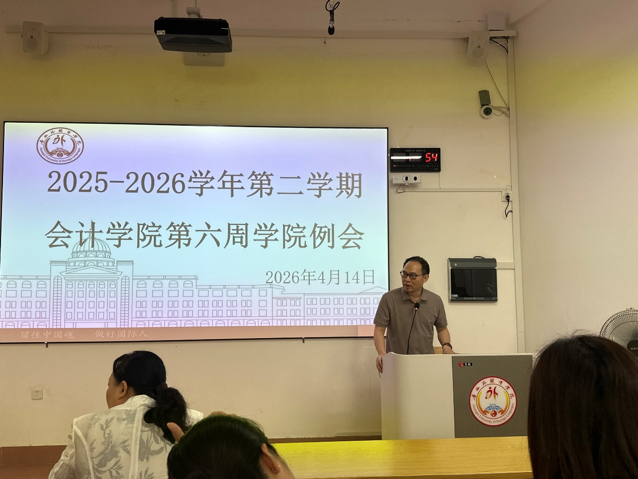 2026年4月14日下午,会计学院在时习楼A305教室召开第六周全体教职工例会。院长李春友教授主持会议,执行院长卢欢、党总支书记兰丽娟、副院长钱宇晴博士、党总支副书记李晶晶及全体教职工参加会议。