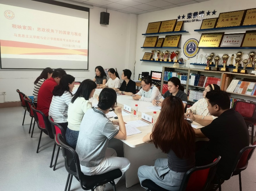 为深入落实立德树人根本任务,扎实推进高校课程思政建设,实现思政课程与课程思政同向同行、协同发力,2026年4月21日下午,会计学院与马克思主义学院在大同楼D301会议室,以“税映家国:思政视角下的国家与税收”为主题,成功召开“课程思政”与“思政课程”协同育人结对共建交流会。会计学院教师党支部副书记颜春主持会议。会计学院党总支书记兰丽娟、马克思主义学院执行院长苏俊吕,以及两学院结对共建教师、会计学院税收系全体教师参会。