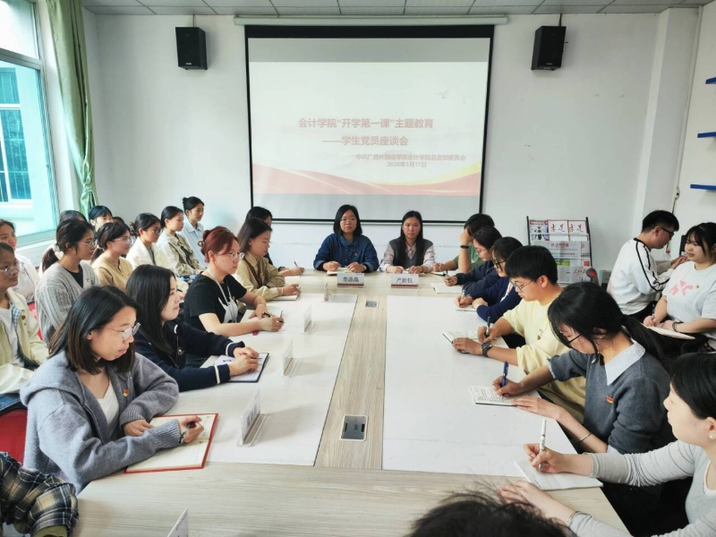 为深入学习贯彻党的二十届四中全会精神与2026年全国两会部署要求,引导学生党员勇担时代使命、发挥先锋模范作用,3月17日,广西外国语学院会计学院召开“开学第一课”主题教育学生党员座谈会。参加本次会议的有会计学院党总支副书记李晶晶同志、宣传委员及统战委员严新钰同志、全体辅导员、学生党支部书记及党员代表。
