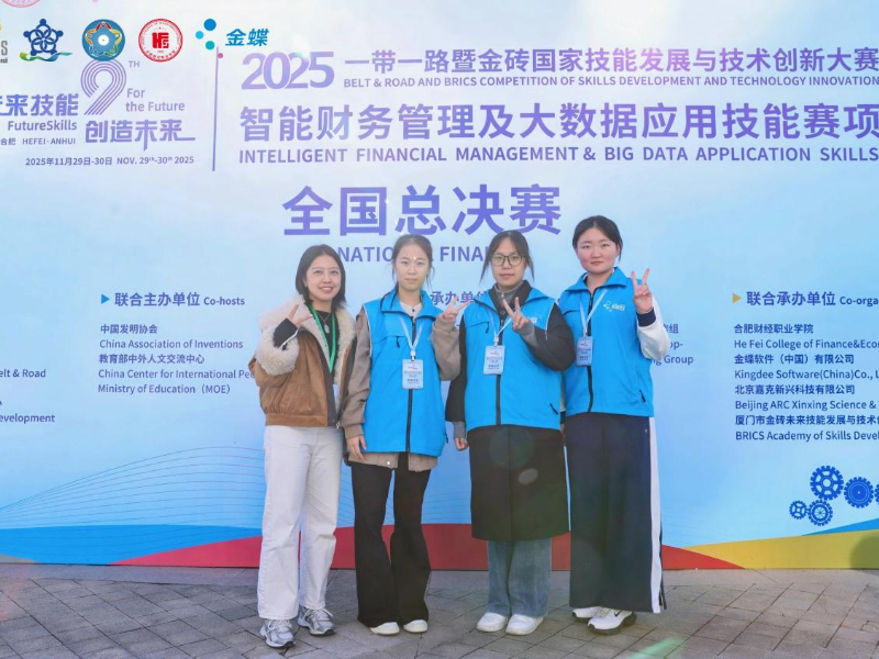 2025一带一路暨金砖国家技能发展与技术创新大赛“智能财务管理及大数据应用技能”全国总决赛在安徽合肥财经职业学院圆满收官。我院张雯丽、柴雅琪、李雨辰同学组成的团队,在指导教师覃嘉薇、潘慧舟的带领下,从全国27个省市自治区的近百支高校代表队中突围,最终斩获三等奖,彰显了本校数智化财经人才的扎实功底。