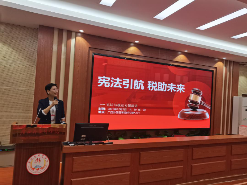 为深入学习贯彻党的二十大精神,大力弘扬宪法精神,推动法治教育与校园人才培养深度融合,2025年12月2日下午,在第十个“国家宪法日”暨宪法宣传周之际,中共国家税务总局南宁市青秀区税务局第一税务分局支部与中共广西外国语学院会计学院教师支部,在广西外国语学院时习楼A101教室联合举办了“结对共建暨宪法宣传进校园”活动。活动以“宪法引航 税助未来”为主题,通过党建结对、专题宣讲、互动问答等形式,为学院师生带来了一场生动的宪法与税收知识普及课。